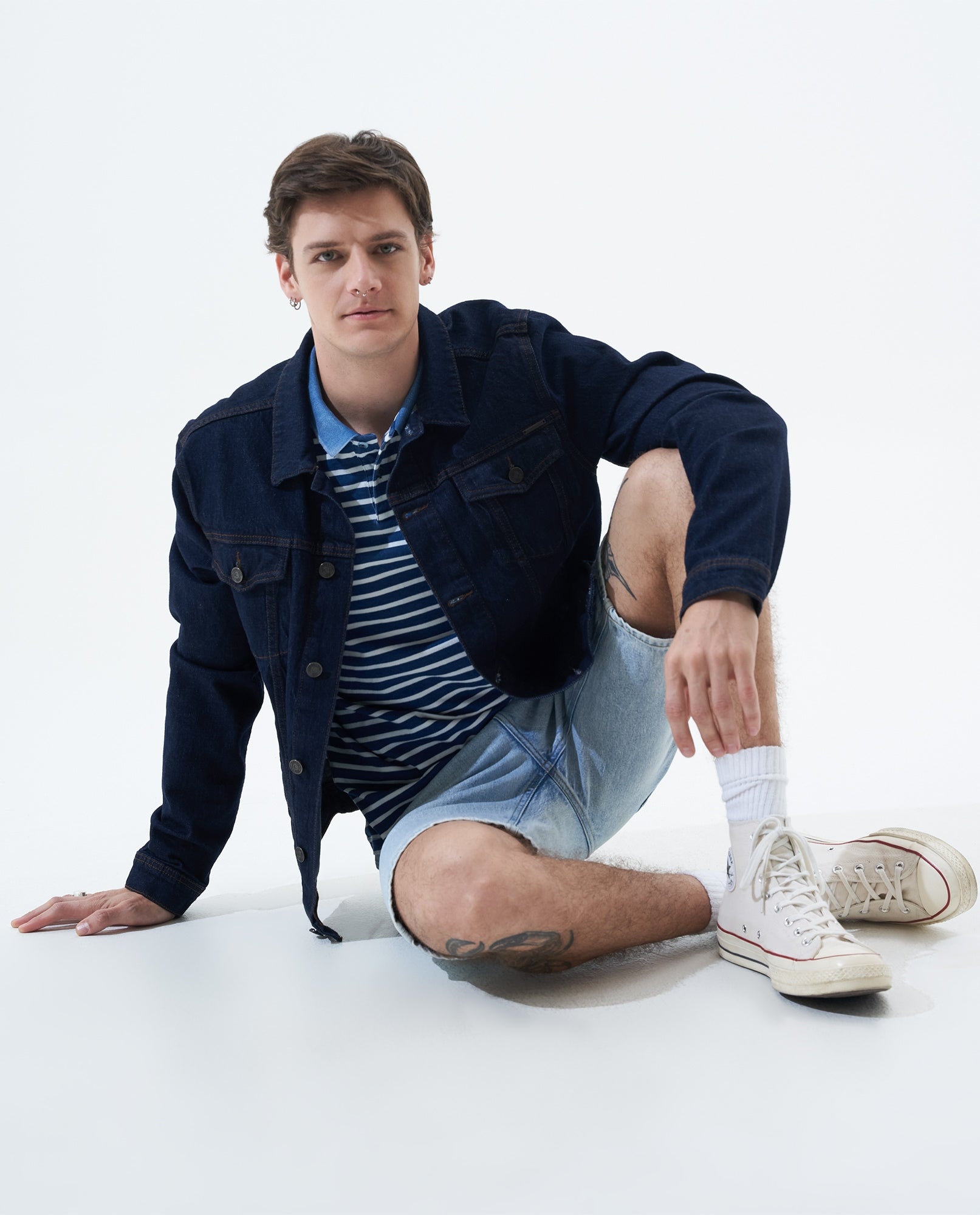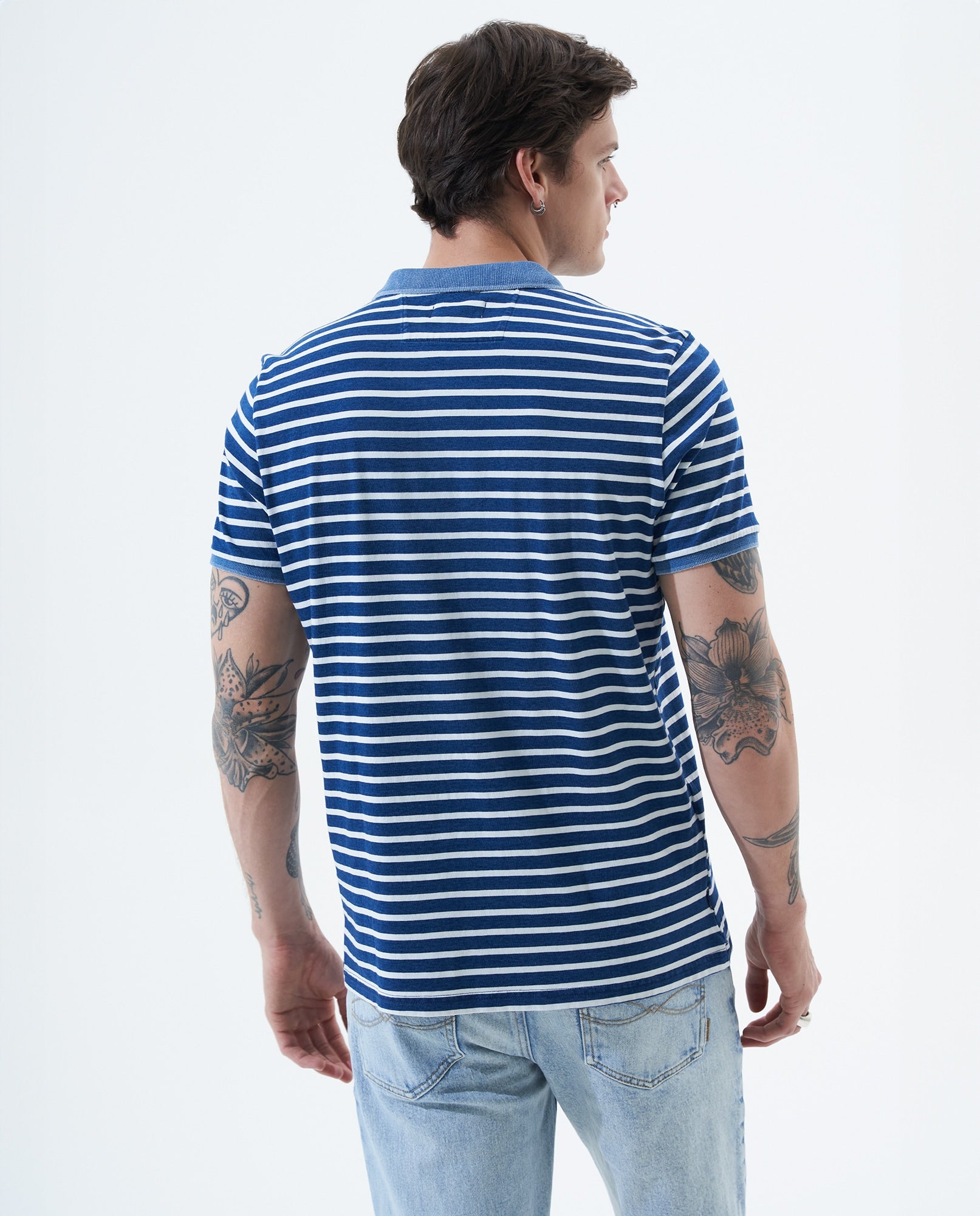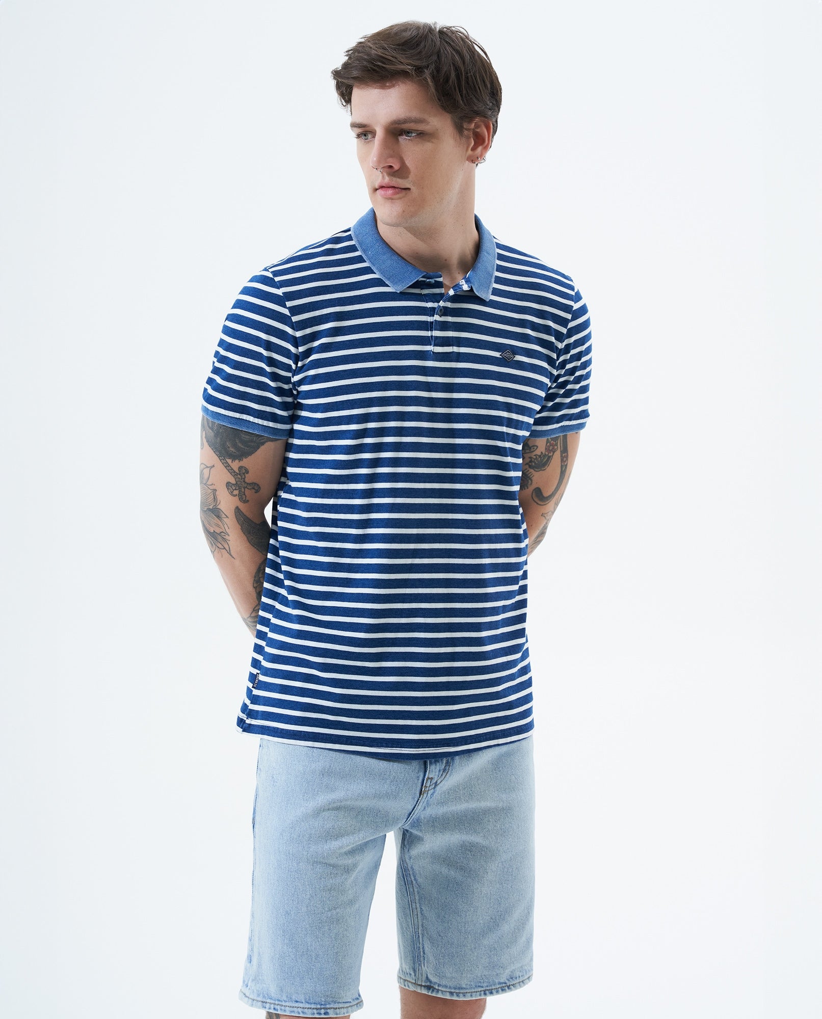Polo para hombre. Classic fit. De manga corta y cuello clásico. Diseño preteñido a rayas. Piezas tejidas con hilos en denim en cuello y puños. Lavado especial. Aplique en punto corazón. Elaborada en material 100% algodón.