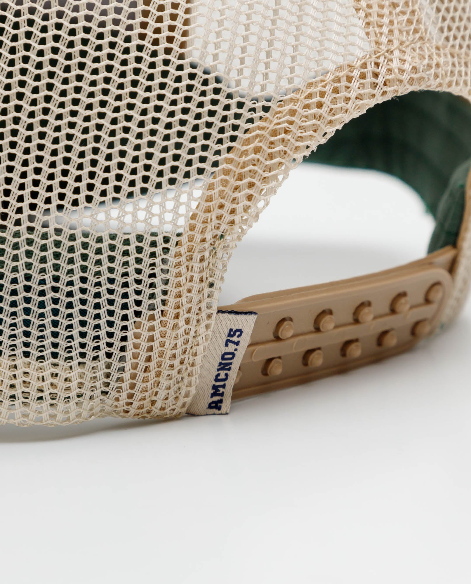Gorra para hombre. Diseño Trucker de cinco cascos. Con malla. Estampada en teja y bordada en frente.