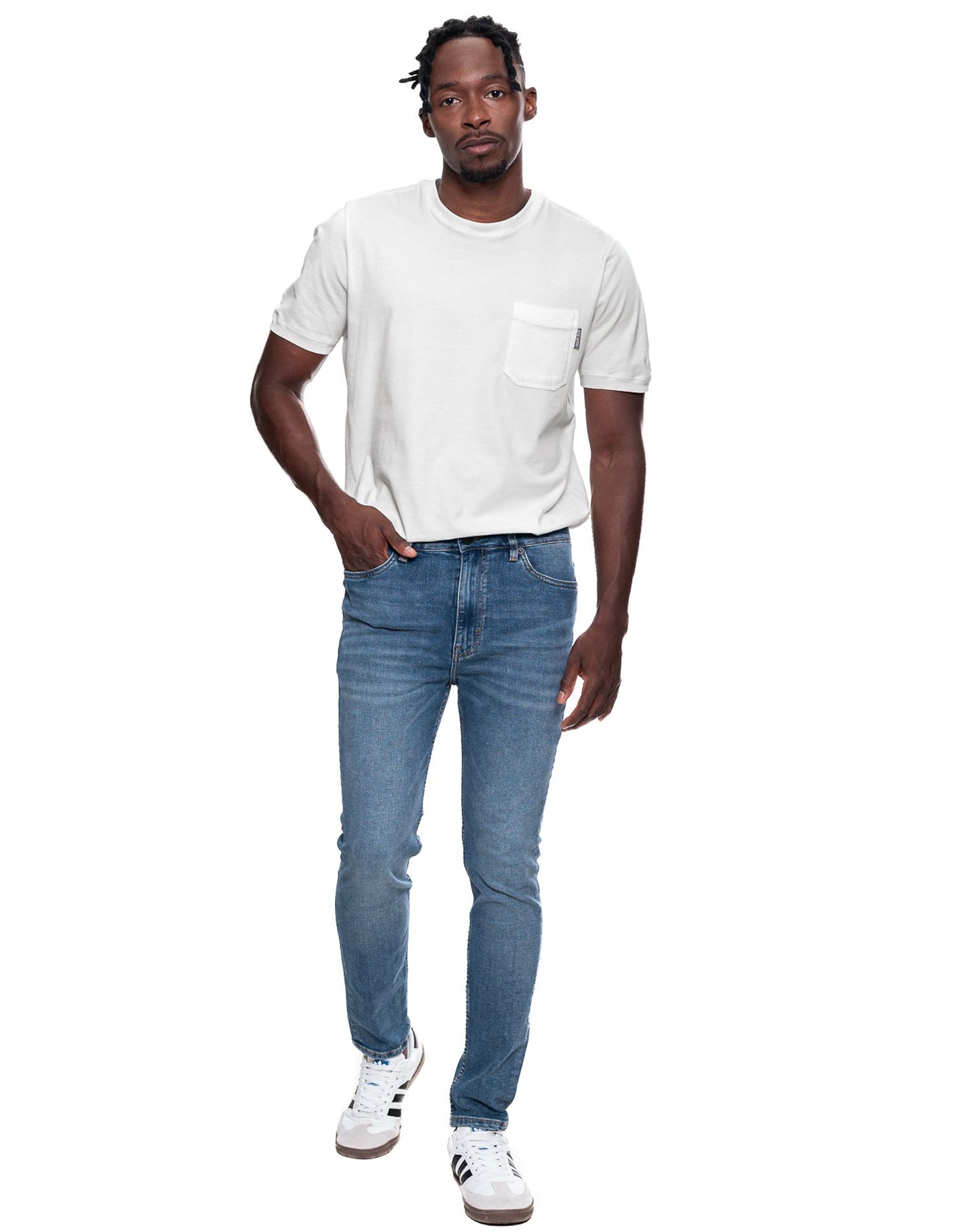 Jeans slim fit medium waist con desgastes tono medio y efecto bigote. Esta prenda está hecha con el corazón por manos Colombianas.