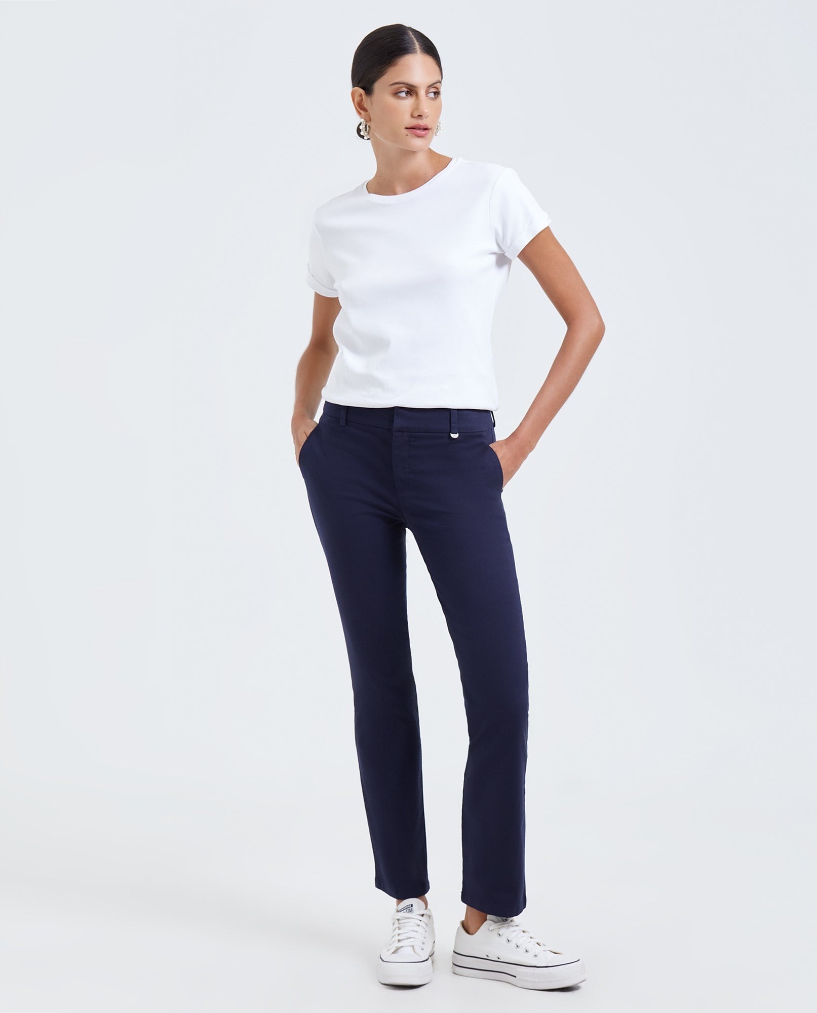 El pantalón de tiro medio, con bota recta, presenta un corte clásico y un diseño atemporal. Su estilo chino combina perfectamente con cualquier prenda que elijas. Confeccionado en algodón ligeramente elástico, ofrece una mayor flexibilidad y una silueta más femenina. Está equipado con trabillas en la cintura, bolsillos decorativos y ajuste mediante cierre y ganchos ocultos. La composición de la prenda es 97% algodón y 3% elastano, mientras que el forro es 100% algodón.
