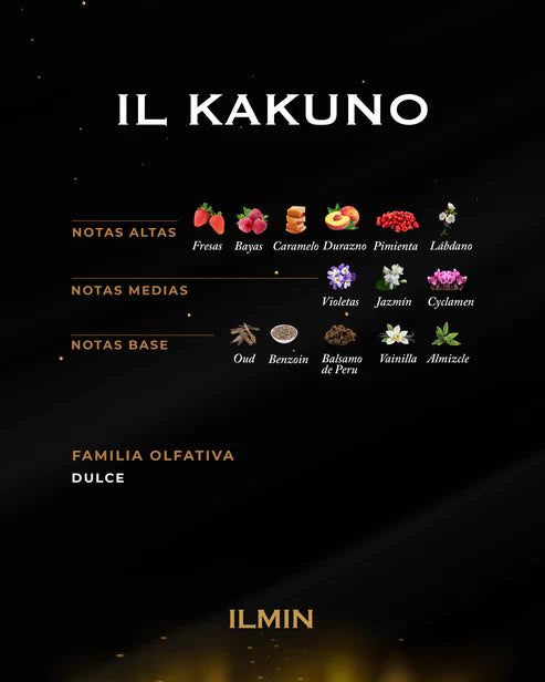 Il Kakuno de ILMIN Parfums es una fragancia de la familia olfativa para Hombres y Mujeres. Il Kakuno se lanzó en 2018. Las Notas de Salida son caramelo, bayas silvestres, pimienta rosa, durazno (melocotón), ládano y fresa; las Notas de Corazón son cipriol (nagarmota), jengibre, cuero, rosa, pachulí y azafrán; las Notas de Fondo son bálsamo del Perú, madera de oud, benjuí, vainilla y almizcle.